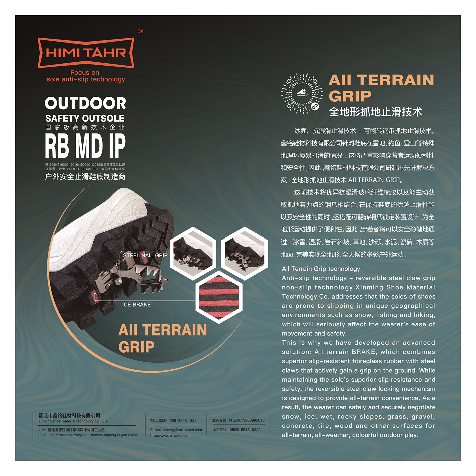 冰面、抗湿滑止滑技术+可翻转钢爪抓地止滑技术。鑫铭鞋材科技有限公司针对鞋底在雪地、钓鱼、登山等特殊地理环境易打滑的情况,这将严重影响穿着者运动便利性和安全性。因此,鑫铭鞋材科技有限公司研制出先进解决方案;全地形抓地止滑技术AII TERRAIN GRIP。这项技术将优异抗湿滑玻璃纤维橡胶以及能主动获取抓地着力点的钢爪相结合。在保持鞋底的优越止滑性能以及安全性的同时,还搭配可翻转钢爪锁定装置设计,为全地形运动提供了便利性.因此,穿着者将可以安全稳健地通过:冰雪、湿滑、岩石斜坡、草地、沙砾、水泥、瓷砖、木质等地面完美实现全地形、全天候的多彩户外运动。